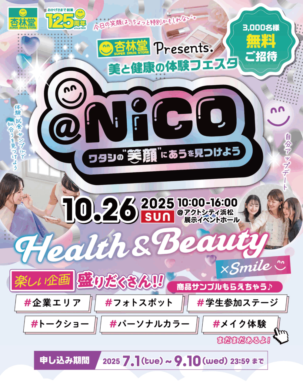 2025年10月26日(日)にアクトシティ浜松にて開催されます「杏林堂Presents.『@Nico2025 ~ワタシの“笑顔”にあうを見つけよう~』」に出展いたします。